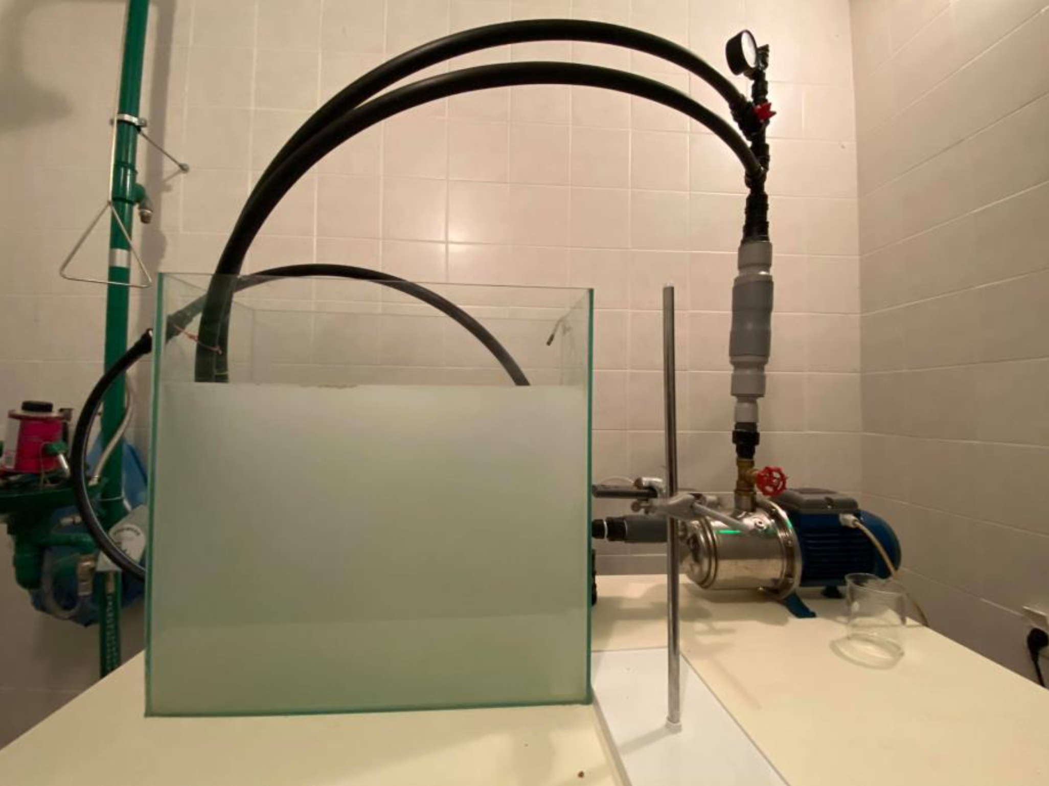 Στο Σχήμα 3 παρουσιάζεται η διάταξη παραγωγής μικρο-φυσαλίδων σε λειτουργία, όπου φαίνεται το παραγόμενο «νέφος» φυσαλίδων την ώρα που η αντλία είναι σε λειτουργία.