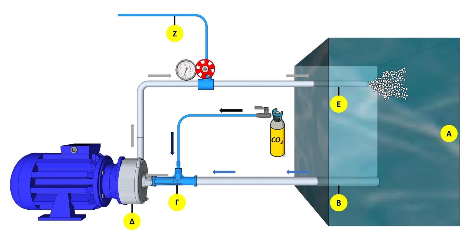 Η διάταξη συνδεδεμένη με την δεξαμενή εμπλουτισμού της υγρής φάσης σε CO2 των ΦΒΑ παρουσιάζεται στην Σχήμα 2. Ο αγωγός Β είναι βυθισμένος μέσα στη δεξαμενή (Α) και αποτελεί την είσοδο της υγρής φάσης (αναρρόφηση) στην αντλία. Πριν την είσοδο της υγρής φάσης στην αντλία μεσολαβεί ένα τμήμα αγωγού (Γ) με στένωμα της διατομής (Ventouri) το οποίο είναι συνδεδεμένο με σωληνάκι που καταλήγει μέσω μια μικρομετρικής βαλβίδας στην παροχής της αέριας φάσης (περιβάλλον, φιάλη CO2, ρύποι κλπ). Η μείωση της διαμέτρου στον αγωγό Ventouri έχει ως αποτέλεσμα την αύξηση της ταχύτητας της υγρής φάσης στο τμήμα εκείνο το οποίο οδηγεί σε μείωση της πίεσης (σύμφωνα με την εξίσωση Bernoulli). Εξαιτίας της απότομης μείωσης της πίεσης, δημιουργείται αναρρόφηση της αέριας φάσης, η παροχή της οποίας ρυθμίζεται με τη μικρομετρική βαλβίδα. Με τον τρόπο αυτό δημιουργούνται οι πρώτες φυσαλίδες στο σύστημα. Στη συνέχεια, το διφασικό μίγμα εισάγεται στην φυγοκεντρική αντλία. Εκεί, ο υψηλός ρυθμός διάτμησης που αναπτύσσεται με την περιστροφή της φτερωτής (Δ) έχει ως αποτέλεσμα τη διάσπαση των φυσαλίδων και τη μείωση του μεγέθους τους. Το νέο διφασικό μίγμα με τις μικρότερες φυσαλίδες (Ε) επιστρέφει στη δεξαμενή. Το τμήμα Ζ αποτελεί παράκαμψη (bypass) μέσω του οποίου μπορεί να ρυθμιστεί η παροχή του μίγματος στην δεξαμενή, ενώ ο έλεγχος της πίεσης του συστήματος γίνεται μέσω ενός μανομέτρου.