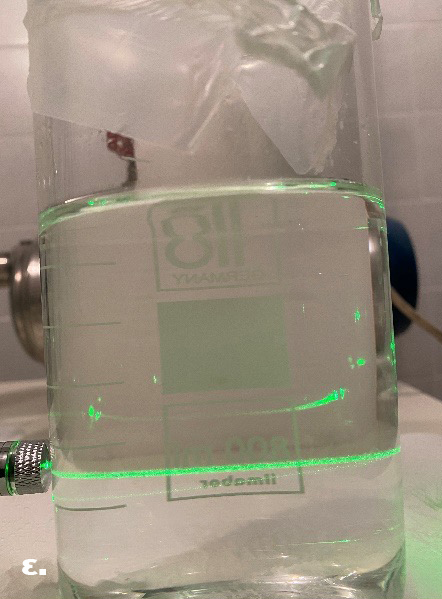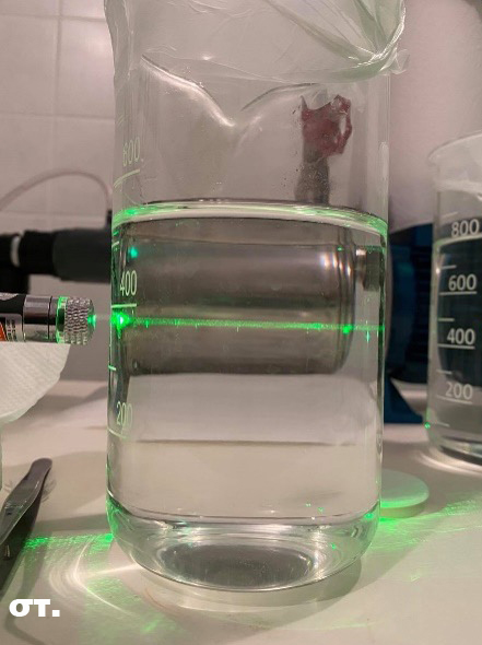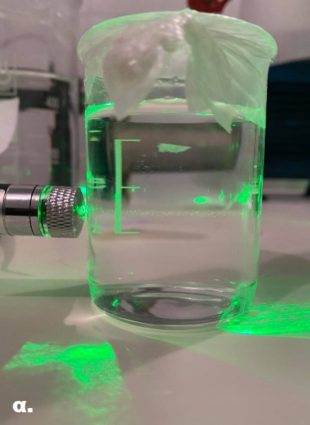 Αν και στο δείγμα αναφοράς παρατηρείται ελάχιστα η δέσμη, ωστόσο είναι φανερή η διαφορά της με την ένταση της στις φωτογραφίες των δειγμάτων που περιέχουν φυσαλίδες. Επίσης, αξίζει να σημειωθεί πως μέσα σε μία εβδομάδα η δέσμη στο δείγμα αναφοράς δεν διακρίνεται σχεδόν καθόλου, γεγονός που υποδεικνύει πως η δέσμη παρατηρείται τις πρώτες μέρες εξαιτίας μικρο-σωματιδίων στο ποτήρι ζέσεως, τα οποία γρήγορα καθιζάνουν.