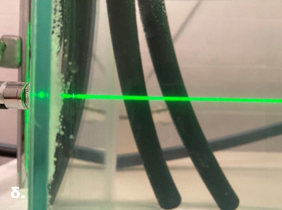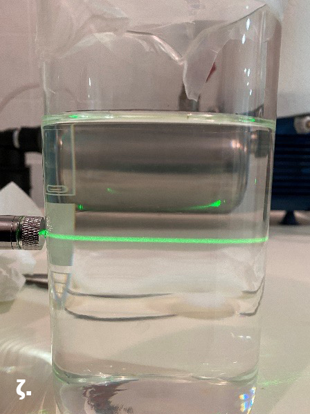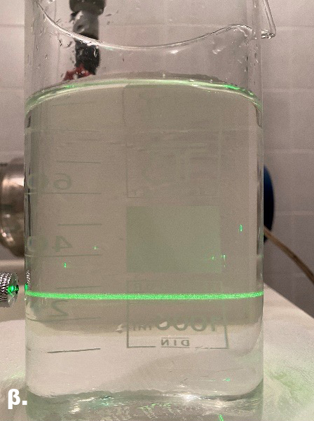 Οι φωτογραφίες φαίνονται στο Σχήμα 6. Αξίζει να σημειωθεί πως χρησιμοποιήθηκε απιονισμένο νερό, μετά από ενδελεχές πλύσιμο/καθαρισμό τόσο της δεξαμενής όσο και των σωληνώσεων/αντλίας, μιας και διαπιστώθηκε πως το νερό της βρύσης περιέχει διάφορα μικρο-σωματίδια που αιωρούνται στη δεξαμενή και αλληλοεπιδρούν με τη δέσμη laser σε πολύ μεγάλο βαθμό ακόμα και στο «καθαρό» νερό (απευθείας από τη βρύση, χωρίς να προστεθούν φυσαλίδες).