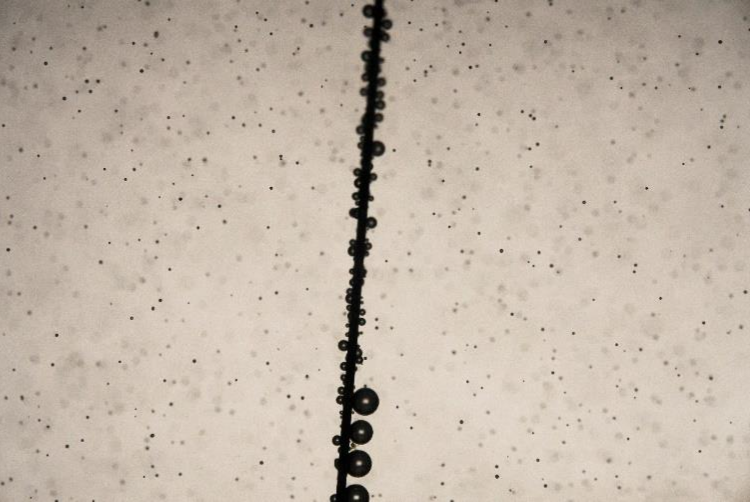 Στο Σχήμα 4 απεικονίζεται μία τυπική φωτογραφία του εσωτερικού της δεξαμενής 10 λεπτά μετά την παύση λειτουργίας της διάταξης (της αντλίας). Το απεικονιζόμενο μεταλλικό σύρμα έχει διάμετρο 159 μm. Είναι φανερό, με μια πρώτη ματιά, πως οι περισσότερες φυσαλίδες είναι κάτω από 50 μm.